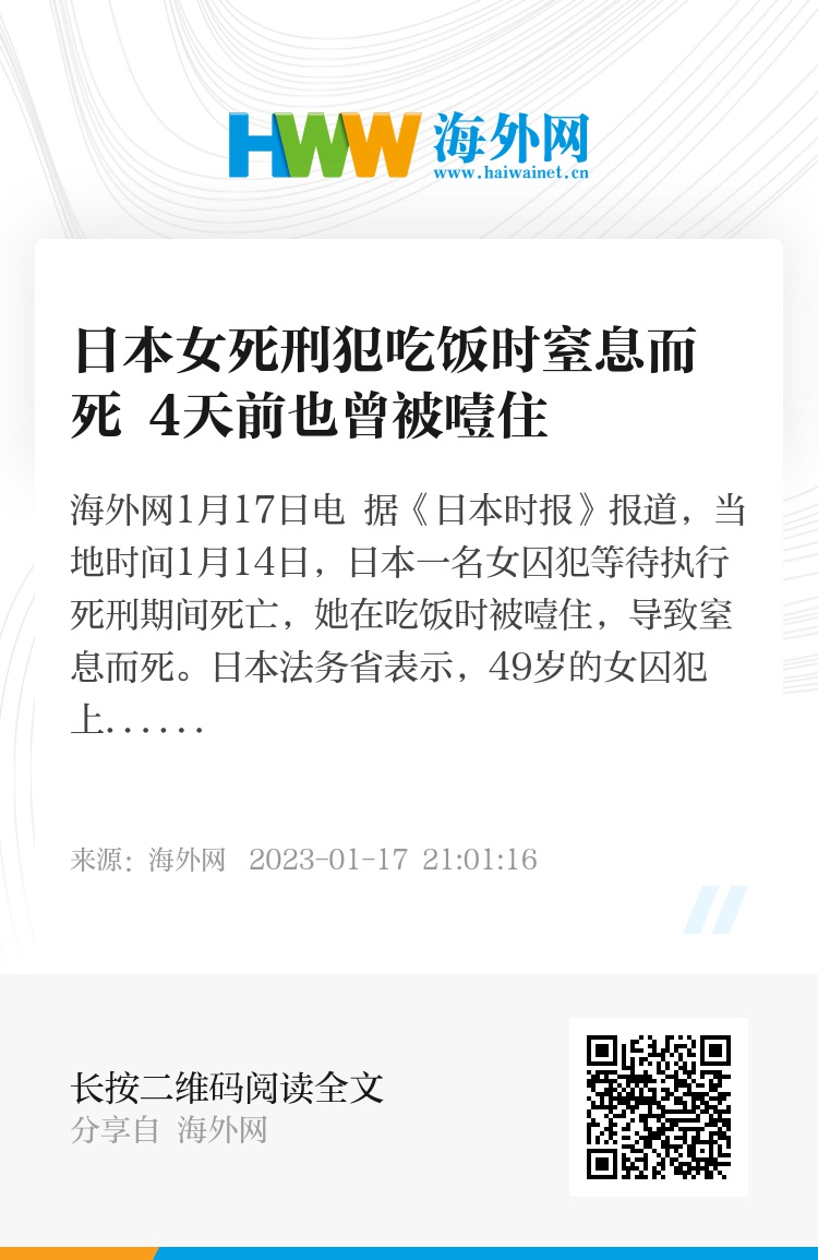 海外网1月17日电 据《日本时报》报道,当地时间1月14日,日本一名女囚犯等待执行死刑期间死亡,她在吃饭时被噎住,导致窒息而死。