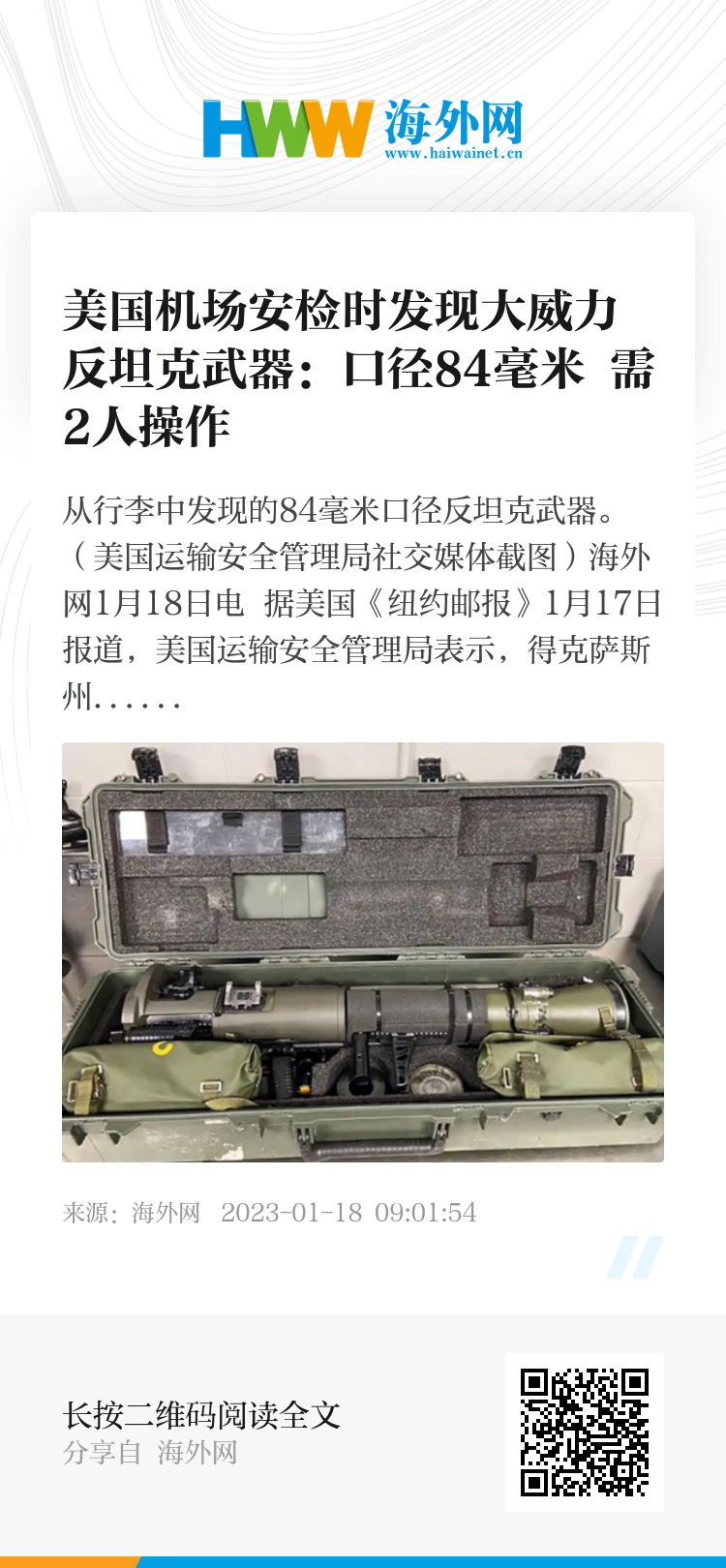 海外网1月18日电 据美国《纽约邮报》1月17日报道,美国运输安全管理局表示,得克萨斯州一座机场的安检人员日前在旅客行李中发现了一把84毫米口径的反坦克武器。其威力巨大,足以击毁一辆坦克。