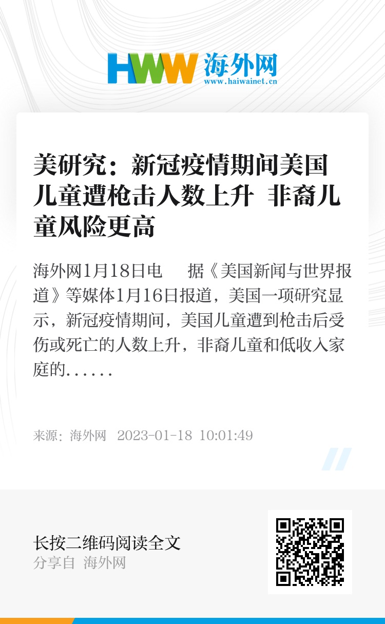 海外网1月18日电 据《美国新闻与世界报道》等媒体1月16日报道,美国一项研究显示,新冠疫情期间,美国儿童遭到枪击后受伤或死亡的人数上升,非裔儿童和低收入家庭的儿童面临更大的风险。