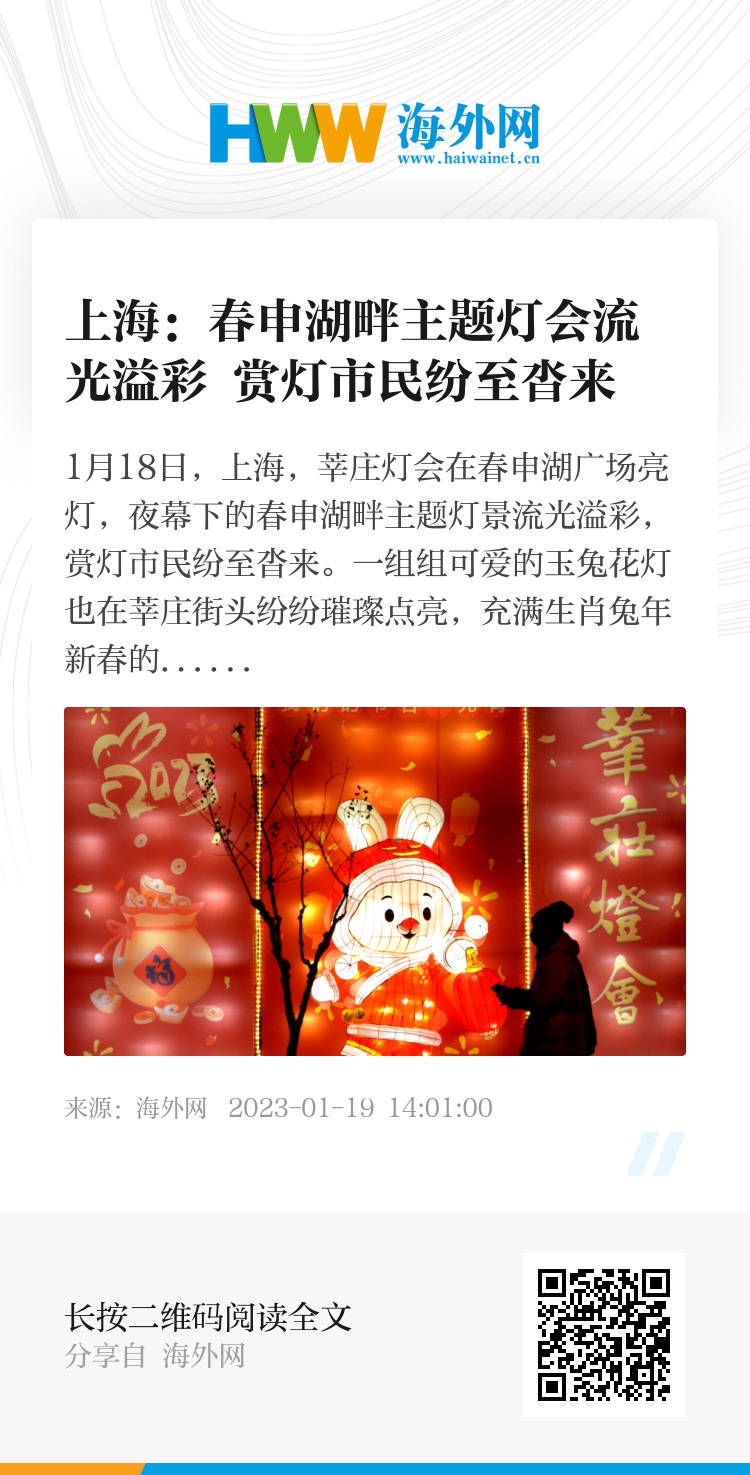 1月18日,上海,莘庄灯会在春申湖广场亮灯,夜幕下的春申湖畔主题灯景流光溢彩,赏灯市民纷至沓来。一组组可爱的玉兔花灯也在莘庄街头纷纷璀璨点亮,充满生肖兔年新春的民俗文化气息。今年莘庄灯会延续将主题花灯分散放置在莘庄周边的主要商圈、主干道沿街,方便广大市民赏灯拍照,感受一份浓浓的非遗文化和灯彩年味。据悉,莘庄灯会即日起每晚亮灯,将持续至2月6日。图片来源:视觉中国