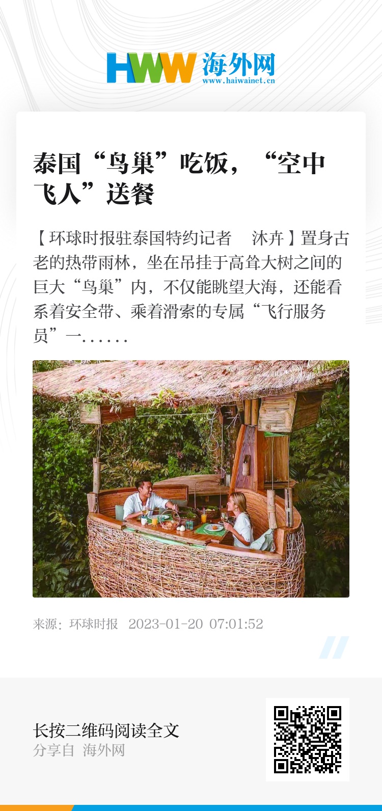 【环球时报驻泰国特约记者 沐卉】置身古老的热带雨林,坐在吊挂于高耸大树之间的巨大“鸟巢”内,不仅能眺望大海,还能看系着安全带、乘着滑索的专属“飞行服务员”一手扶滑索,一手提食篮,在高空中嗖嗖地往来穿梭于树木林间为客人上菜。这恐怕是世上难觅的体验了,如果你好奇想要感受这种奇妙,就来泰国狗骨岛吧,岛上的树屋餐厅会满足你的一切想象。