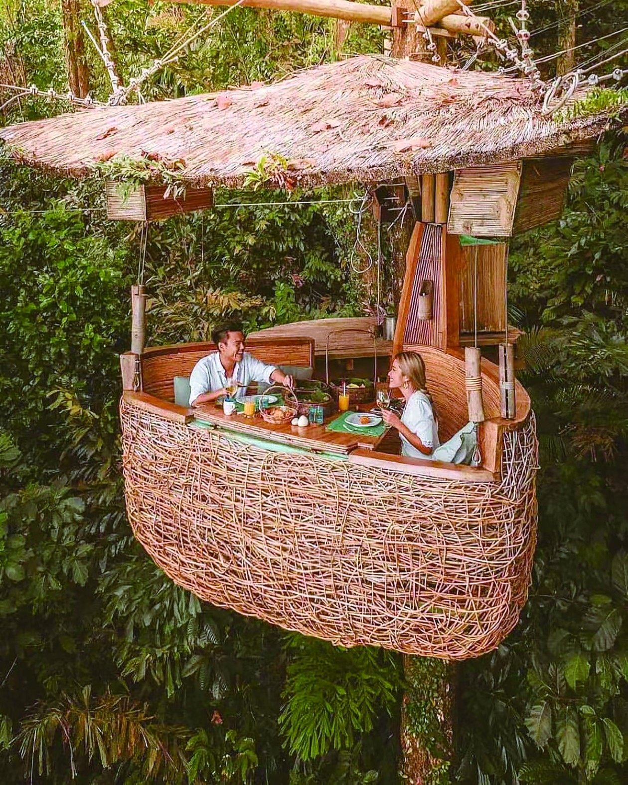 树屋餐厅的设计灵感来自鸟类编织的鸟巢外形以及对童年自由奔放天性释放的渴望。吊舱整体由当地工匠用竹子手工打造,舱体外侧用当地采收的藤条编织包裹,状似一个大鸟巢,非常结实,舱体上方有木质遮阳顶棚,上面覆盖藤条和蒲草装饰。内部是弧形三边环绕的心形形状,“心”的一边与舌形餐桌顶靠并将其牢牢固定,另外两边向内逐渐收拢但不闭合,留出将近1米的开口作为吊舱出入口。餐桌两侧都有固定在舱体上的小长椅,可同时容纳4人。