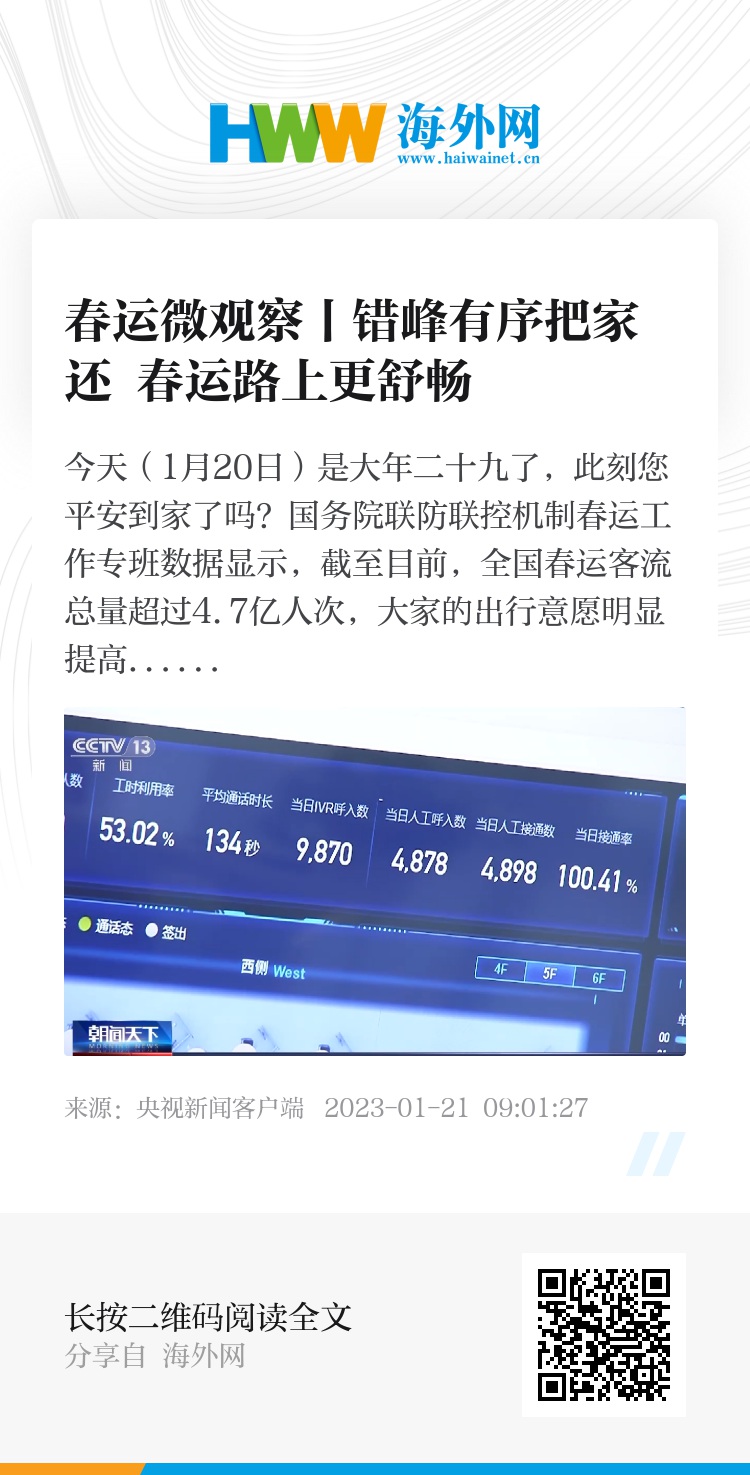 国务院联防联控机制春运工作专班数据显示,截至目前,全国春运客流总量超过4.7亿人次,大家的出行意愿明显提高。今年的春运回家路,大家走得顺利吗?有什么新特点?来看今天的春运微观察。