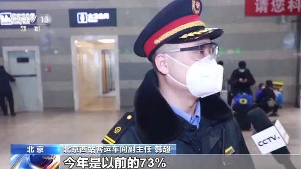 北京西站客运车间副主任 韩超:以前高峰期的时候,腊月二十八,西站的旅客发送量大概在25万人次左右,今年差不多是以前的73%。旅客提前走,我们也可以根据客流情况动态调整列车开行数量,春运期间每天最多加开旅客列车23列。
