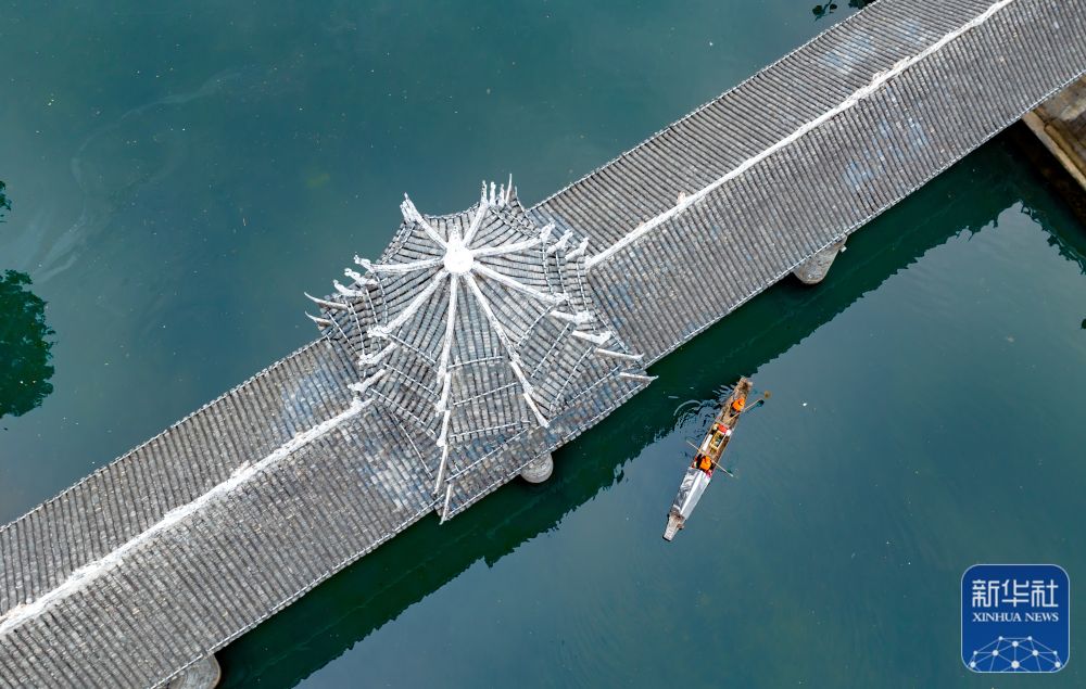 1月21日,湖南省怀化市通道侗族自治县双江镇,环卫工人在江面上打捞漂浮物 (无人机照片)。新华社发(粟勇主摄)