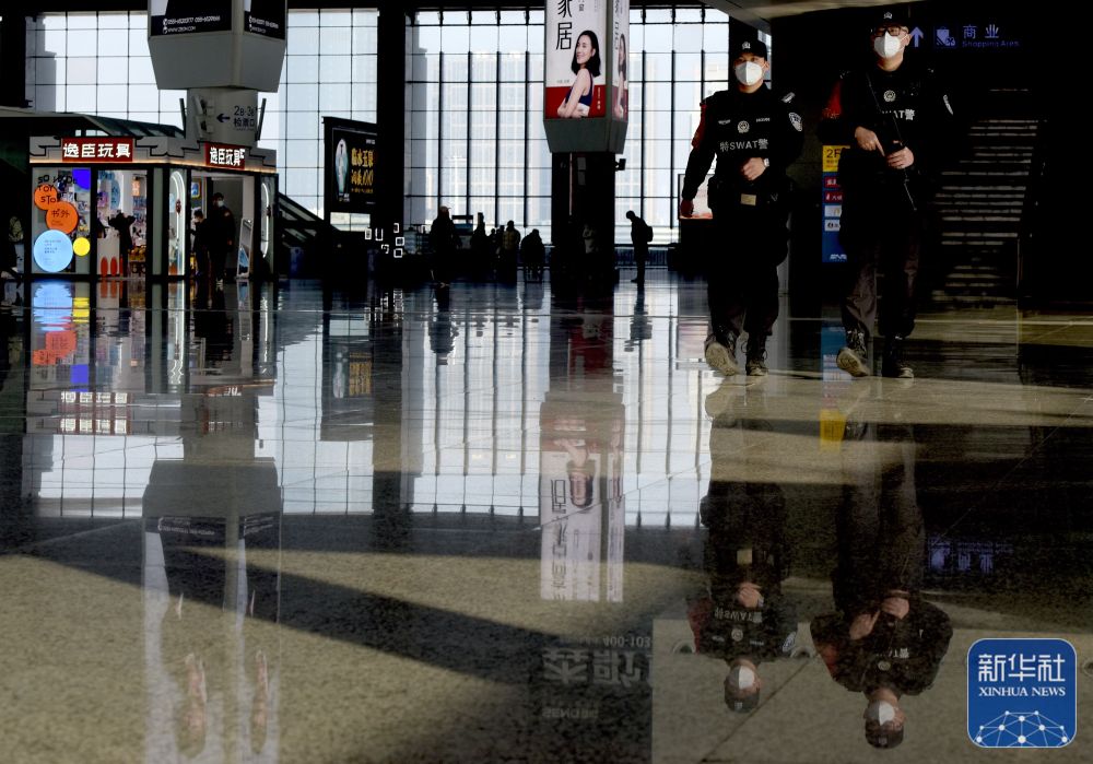 1月21日,合肥铁路公安处特警支队特警陈黎(左)和张晨曦在合肥南站内巡逻。新华社记者 郭晨 摄
