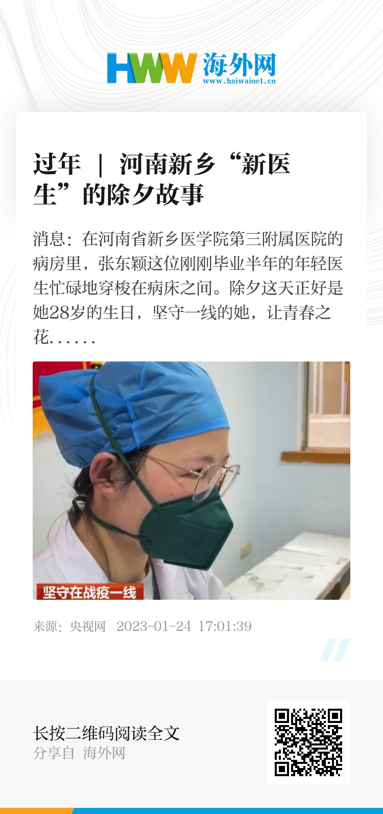 央视网消息:在河南省新乡医学院第三附属医院的病房里,张东颖这位刚刚毕业半年的年轻医生忙碌地穿梭在病床之间。除夕这天正好是她28岁的生日,坚守一线的她,让青春之花绽放在抗疫一线。