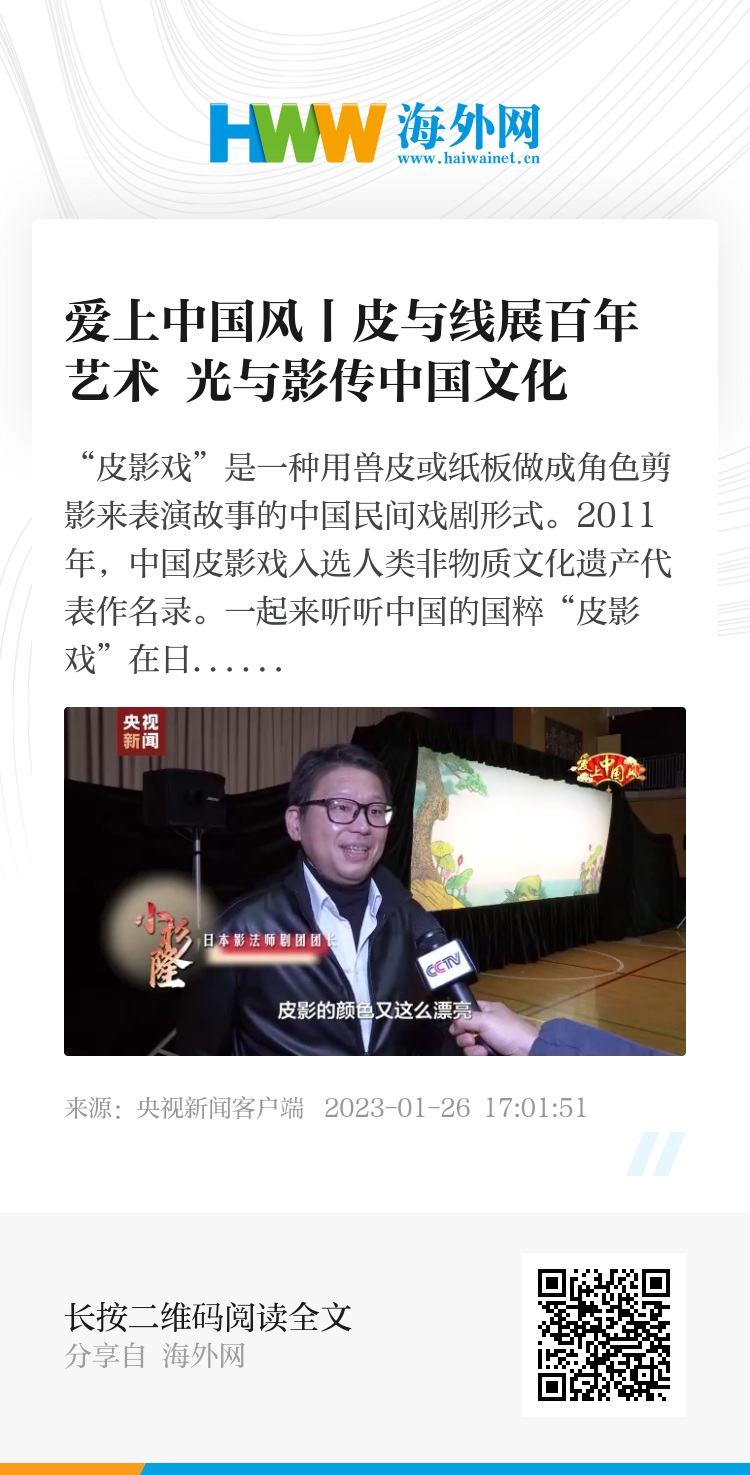 “皮影戏”是一种用兽皮或纸板做成角色剪影来表演故事的中国民间戏剧形式。2011年,中国皮影戏入选人类非物质文化遗产代表作名录。一起来听听中国的国粹“皮影戏”在日本从生根发芽到广受赞誉的故事。