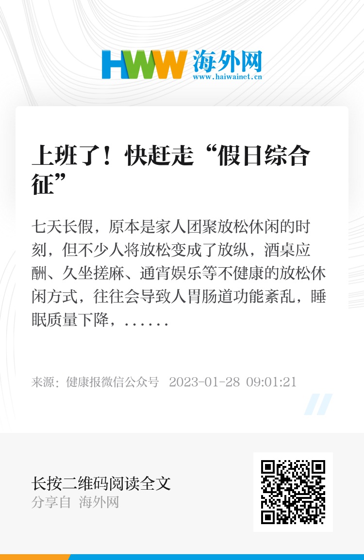 生活规律被打乱后,人体的生物钟被强行改变,使得脑神经系统、消化系统、循环系统等出现不适,此时人体内部的抵抗力下降,各种疾病会乘虚而入。长假后,尽量调整好自己的作息时间。此外,睡前泡个热水澡,或者用热水泡脚,可以增强血液循环,按摩足底脚趾对疏通经络、调整脏腑、促进血液循环、增强新陈代谢有重要作用,尤其是对神经衰弱、失眠、头痛等均有疗效或辅助治疗作用。此外,上班前要好好洗个澡,洗澡可消除体表代谢物,使毛细血管扩张,有效消除疲劳。