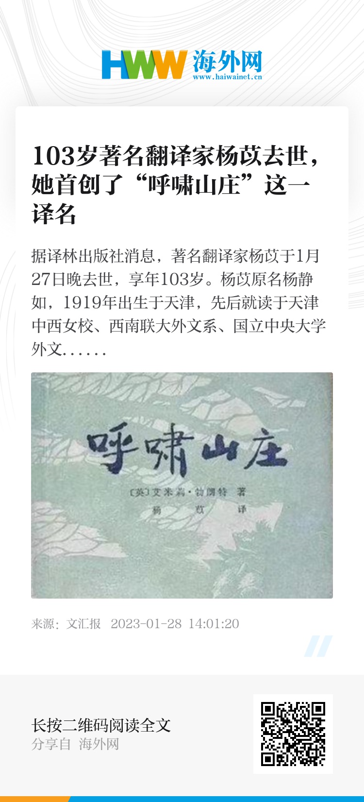 1955年6月,《呼啸山庄》由平明出版社出版,英国作家艾米莉·勃朗特一生中唯一的一部小说从此走进了国人的视野,正是杨苡首创了“呼啸山庄”这一译名,并且她的这个译本再版了数十次,已然成为中国文学记忆中的瑰宝。