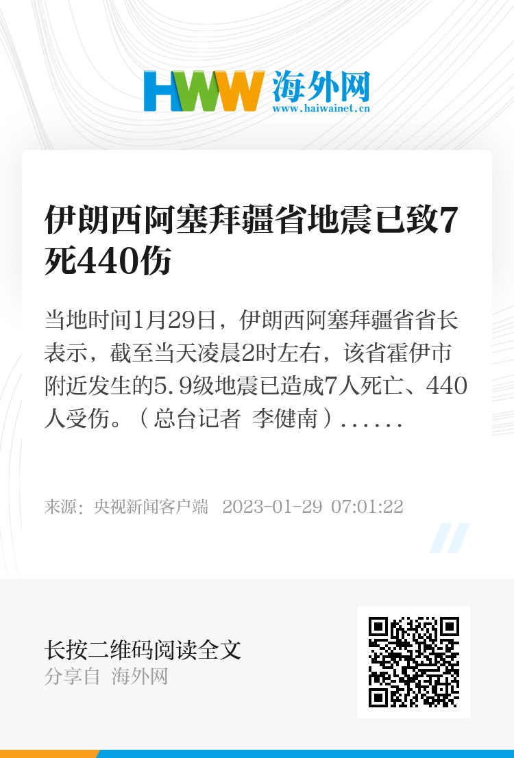 当地时间1月29日,伊朗西阿塞拜疆省省长表示,截至当天凌晨2时左右,该省霍伊市附近发生的5.9级地震已造成7人死亡、440人受伤。(总台记者 李健南)