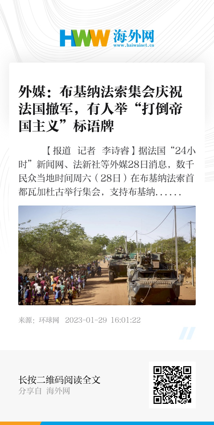 据此前报道,自去年9月以来,前法国殖民地布基纳法索的反法情绪有所增加。本月20日,数百人在瓦加杜古街头示威,要求法国驻布大使和驻扎在瓦加杜古东北部坎布安森军营的法国军队撤离。布基纳法索通讯社21日晚报道,布过渡政府终止了2018年12月生效、允许法国在布领土驻军的军事协议。法国总统马克龙22日表示,他对这一传闻持谨慎态度,要求布基纳法索过渡总统特拉奥雷予以澄清。