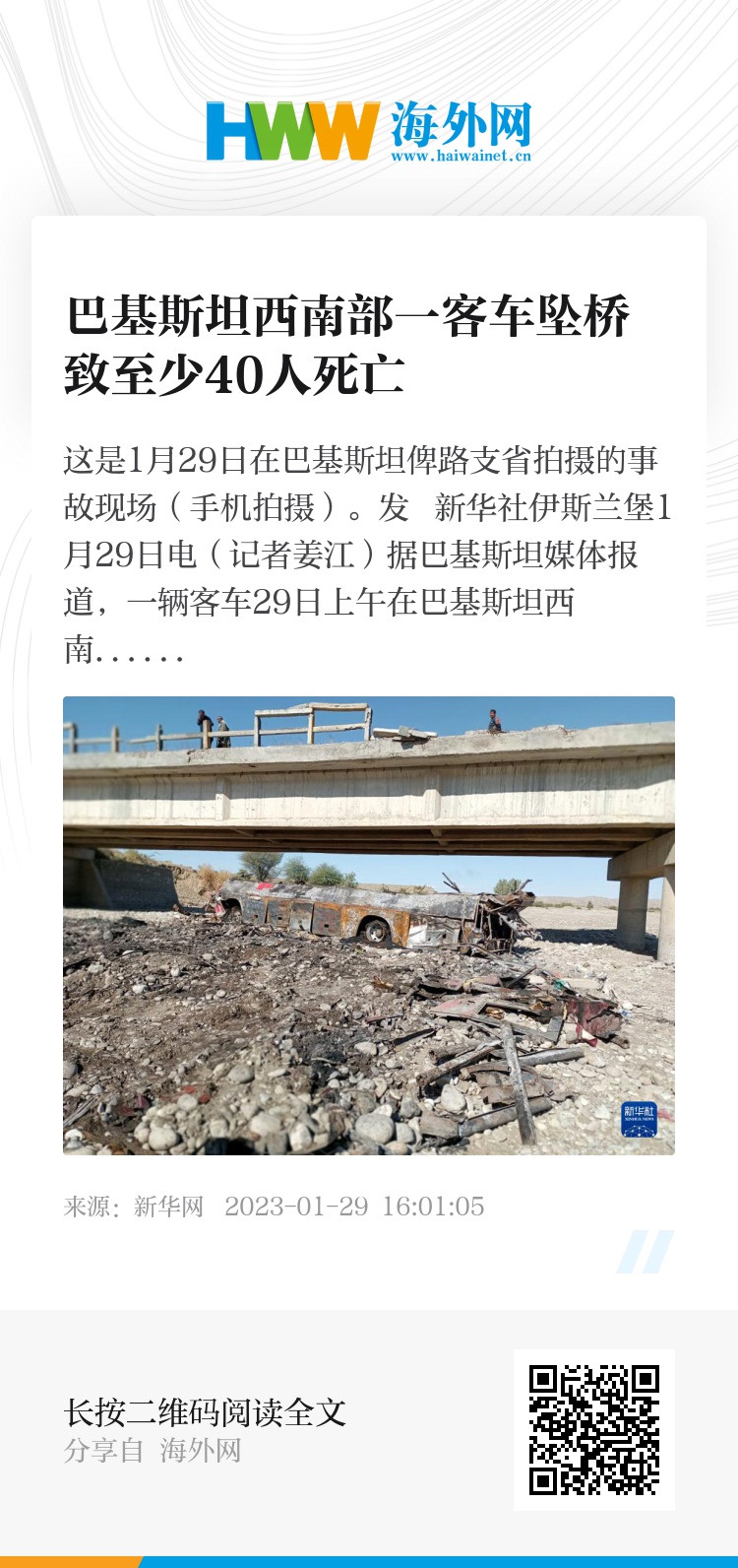 新华社伊斯兰堡1月29日电(记者姜江)据巴基斯坦媒体报道,一辆客车29日上午在巴基斯坦西南部的俾路支省一座桥上坠落,造成至少40人死亡。