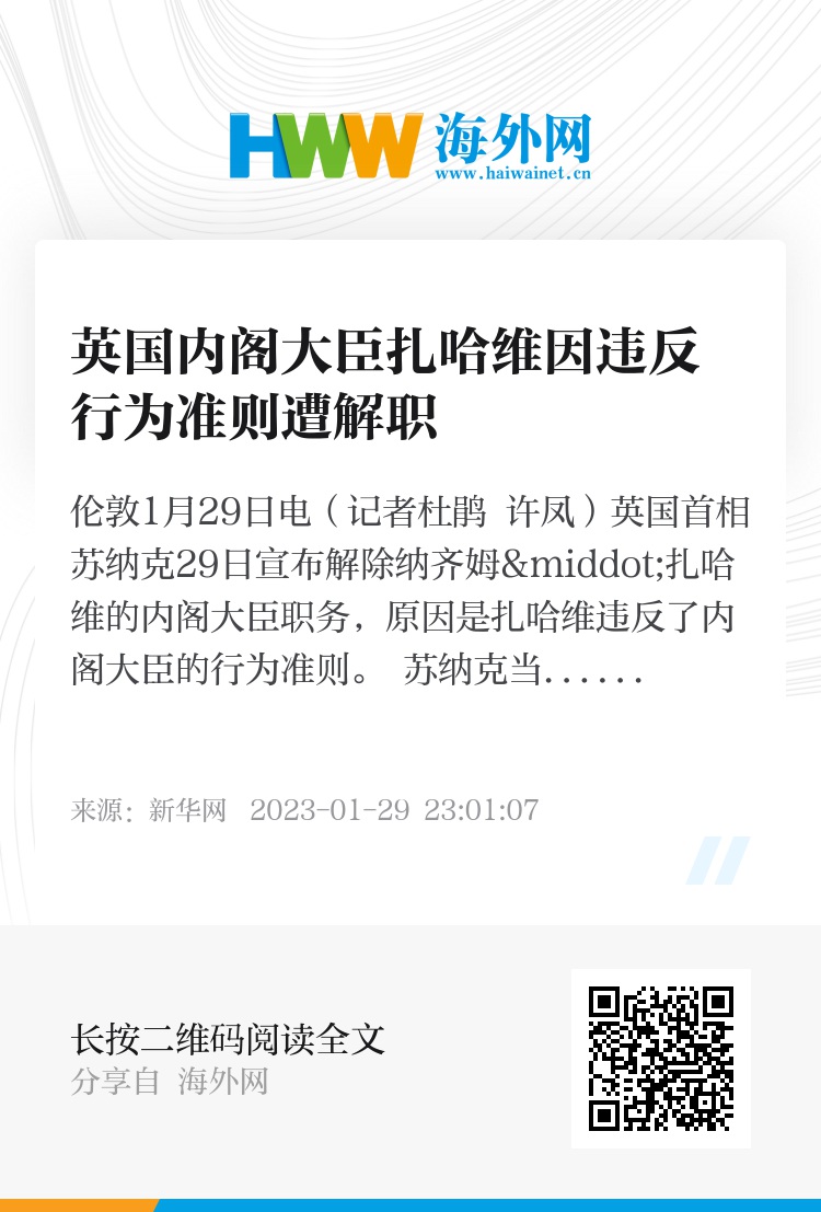 新华社伦敦1月29日电(记者杜鹃 许凤)英国首相苏纳克29日宣布解除纳齐姆·扎哈维的内阁大臣职务,原因是扎哈维违反了内阁大臣的行为准则。