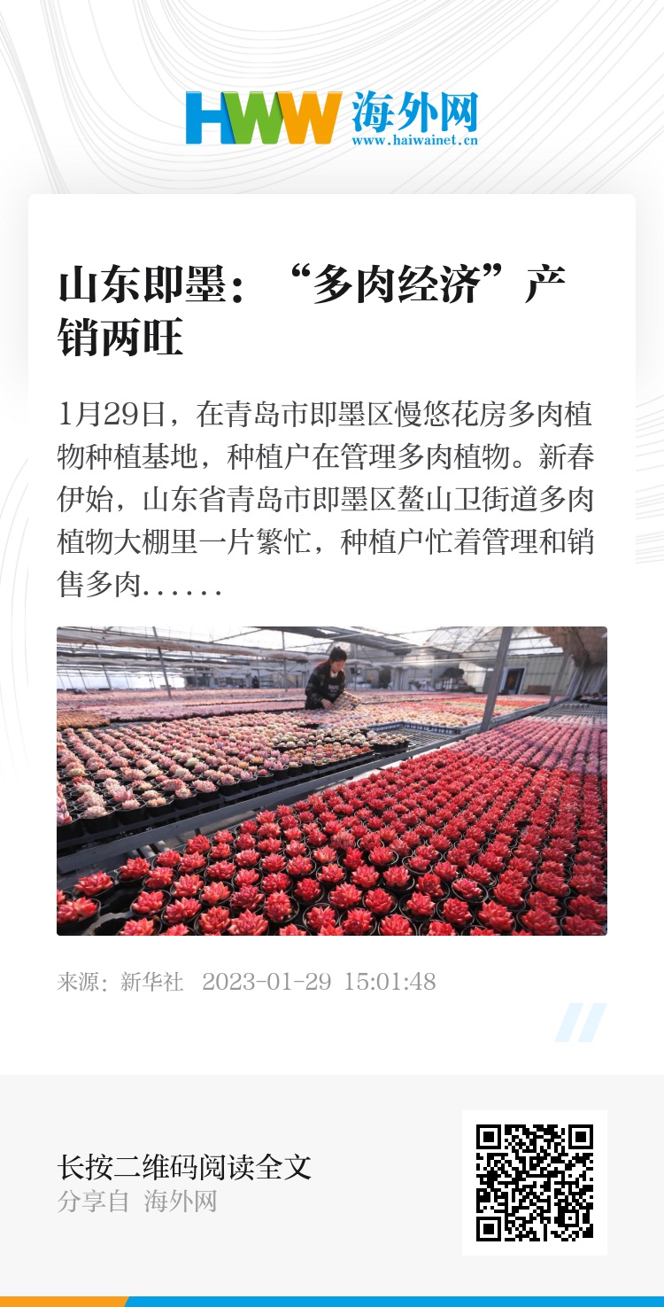 1月29日,在青岛市即墨区慢悠花房多肉植物种植基地,种植户在管理多肉植物。新春伊始,山东省青岛市即墨区鳌山卫街道多肉植物大棚里一片繁忙,种植户忙着管理和销售多肉植物。近年来,当地大力发展多肉植物特色种植,结合市场需求积极推行线上和线下相结合的销售模式,带动农民增收,助力乡村振兴。新华社发(梁孝鹏 摄)
