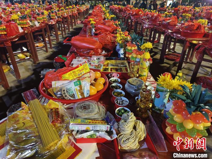 现场300多张桌子,摆满了水果、供品、香料等。 廖珍妹 摄