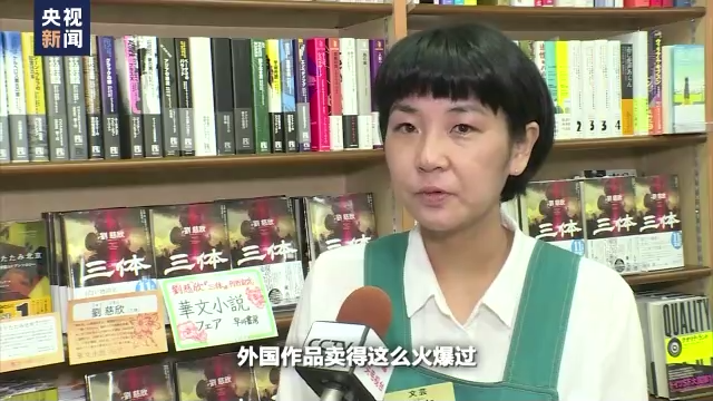 记者胡怡晟:我现在所在的是日本东京池袋车站附近的一家大型书店,在三楼的小说区,我们可以看到一进来就会发现《三体》日语版的小说被摆在了最显眼的位置。