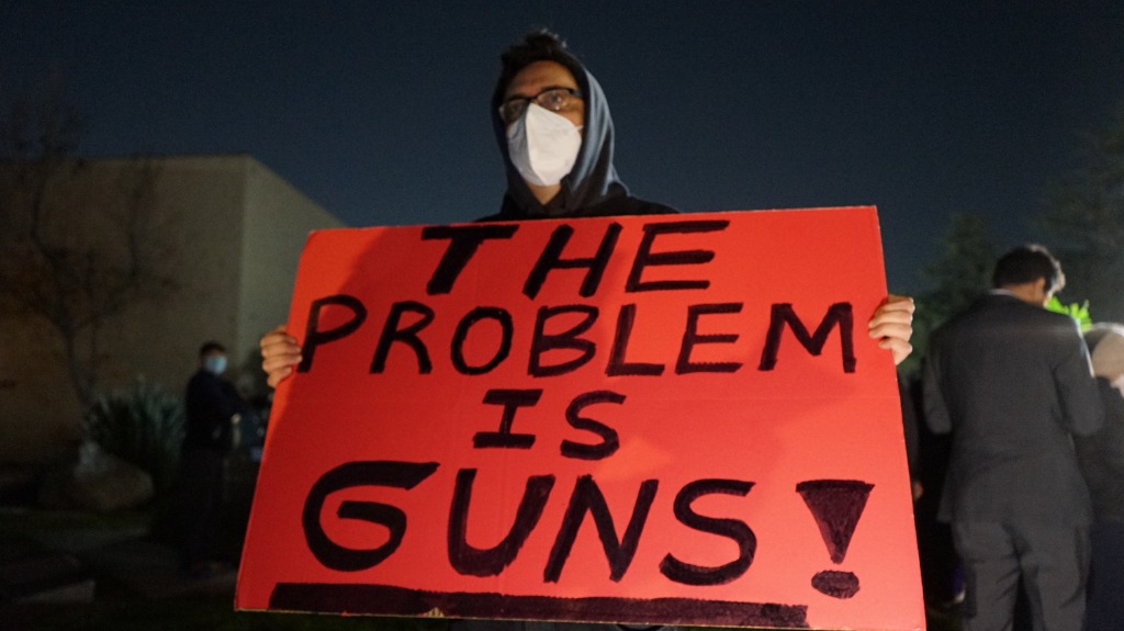 1月23日,在美国加利福尼亚州洛杉矶县蒙特雷帕克市举行的烛光悼念会上,一名男子手持抗议枪支暴力的标语牌。新华社发(曾慧摄)