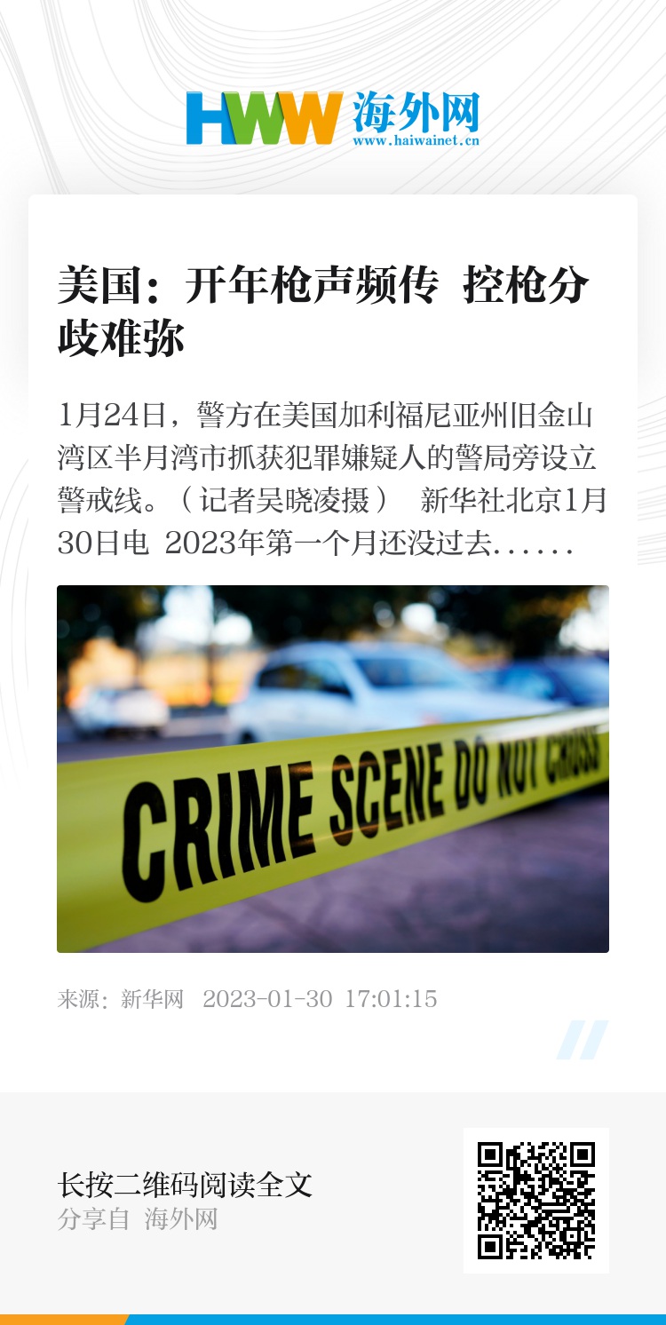新华社北京1月30日电 2023年第一个月还没过去,美国加利福尼亚州8天内发生了4起群体性枪击事件: