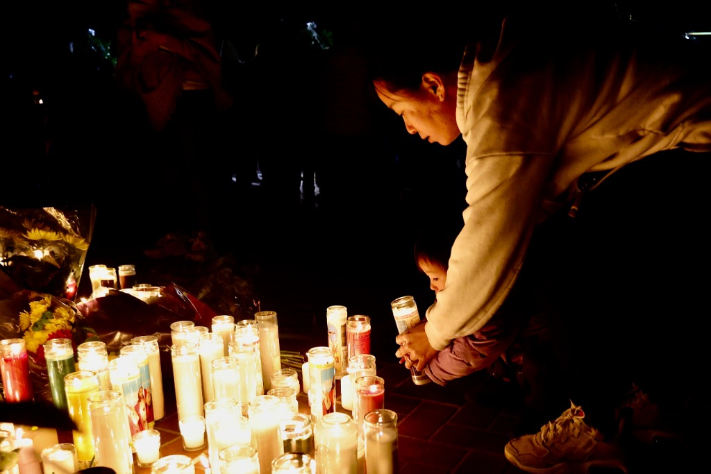 1月27日,人们在美国加利福尼亚州半月湾市举行的守夜活动中哀悼枪击事件遇难者。(新华社记者吴晓凌摄)