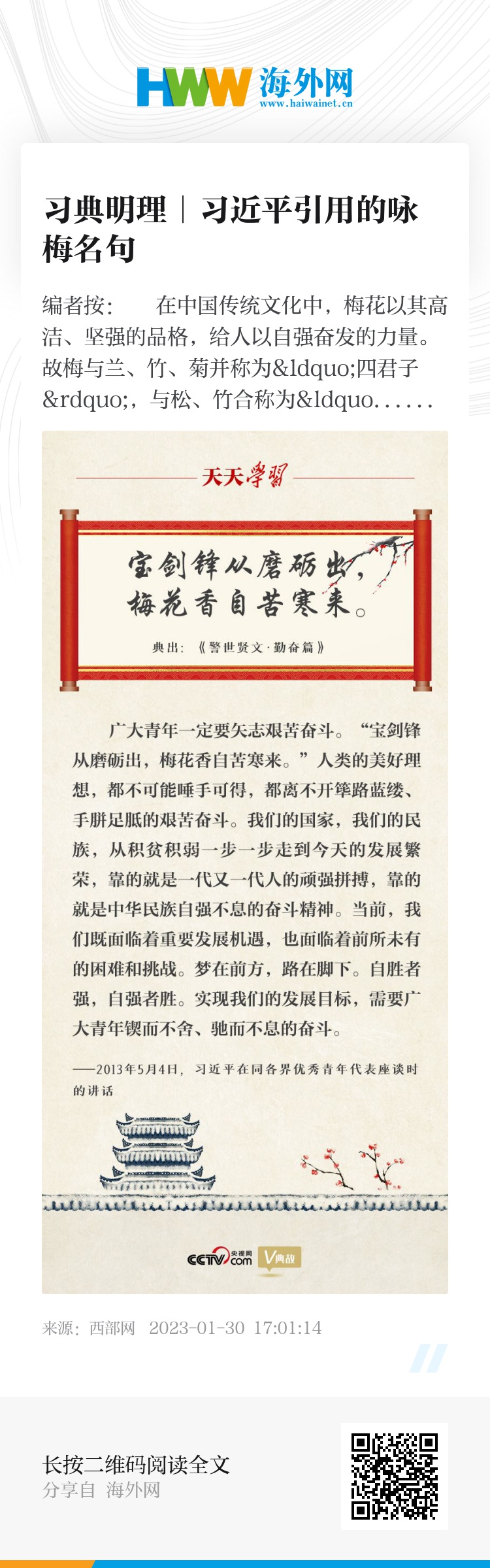 梅花初绽放,赏梅正当时。伴着阵阵梅香,央视网《天天学习》与您一起学习领会这些咏梅名句。
