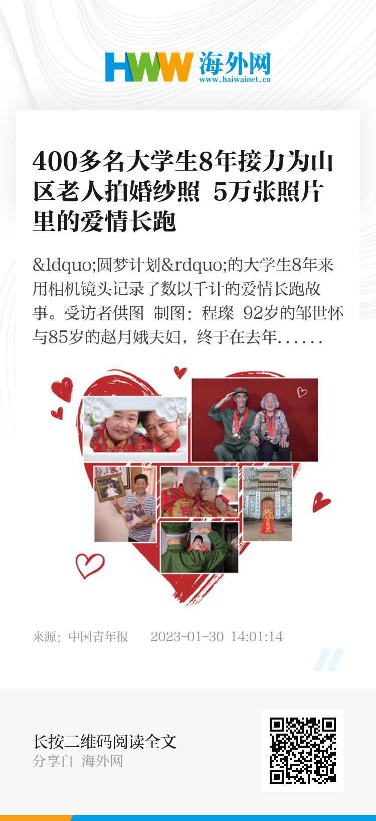 从2015年起,每年寒暑假,这个团队都会自带服装和摄影器材,前往农村、社区、敬老院,为老年夫妻补拍一套婚纱照,再将照片一一洗印、装裱,无偿赠予老人,开启了一场记录数以千计爱情长跑故事的接力赛。