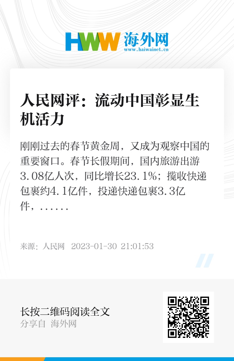 看流动的中国,还要看发展的广度。中国的发展是立足世界、面向世界、融入世界的,开放的中国能让流动中国的方向更加开阔。以今年春节为例,中国老百姓的出境游同步复苏。向外的脚步给不少国家和地区释放出积极信号,即流动起来的中国将为世界经济带来暖意,也将有力带动周边及更多国家经济复苏。中国有这个能力和信心,也向世界展现了行动与诚意。从这个意义上说,流动中国带来的活跃景象,不仅为自身更好发展打好了基础,而且为世界经济复苏创造了机遇。