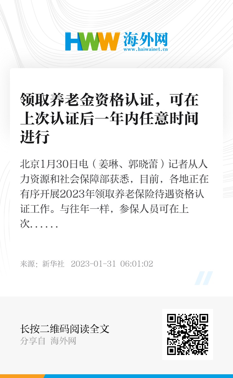 新华社北京1月30日电(姜琳、郭晓蕾)记者从人力资源和社会保障部获悉,目前,各地正在有序开展2023年领取养老保险待遇资格认证工作。与往年一样,参保人员可在上次认证后的12个自然月内任意选择时间进行认证。