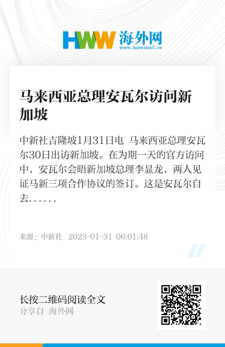 中新社吉隆坡1月31日电 马来西亚总理安瓦尔30日出访新加坡。在为期一天的官方访问中,安瓦尔会晤新加坡总理李显龙,两人见证马新三项合作协议的签订。