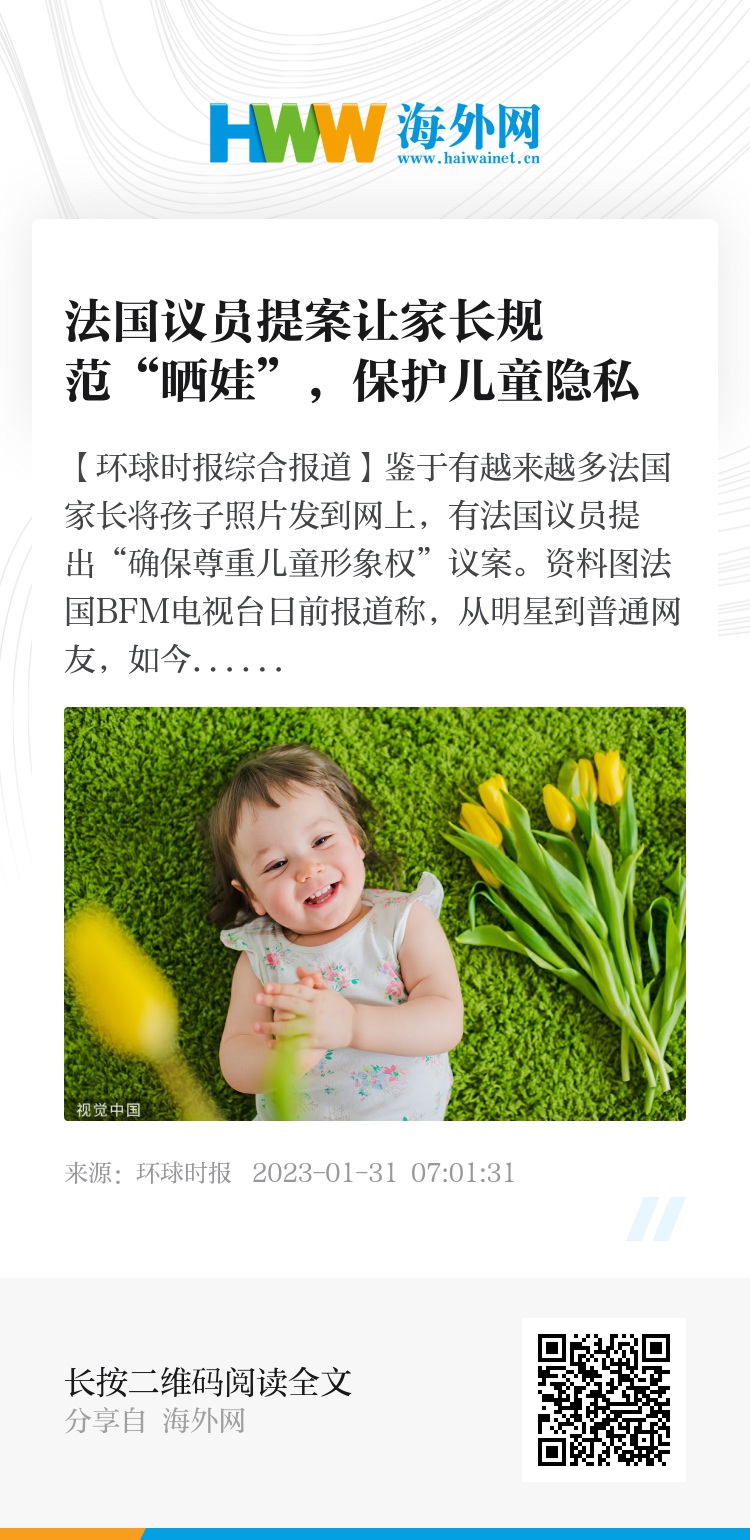 【环球时报综合报道】鉴于有越来越多法国家长将孩子照片发到网上,有法国议员提出“确保尊重儿童形象权”议案。