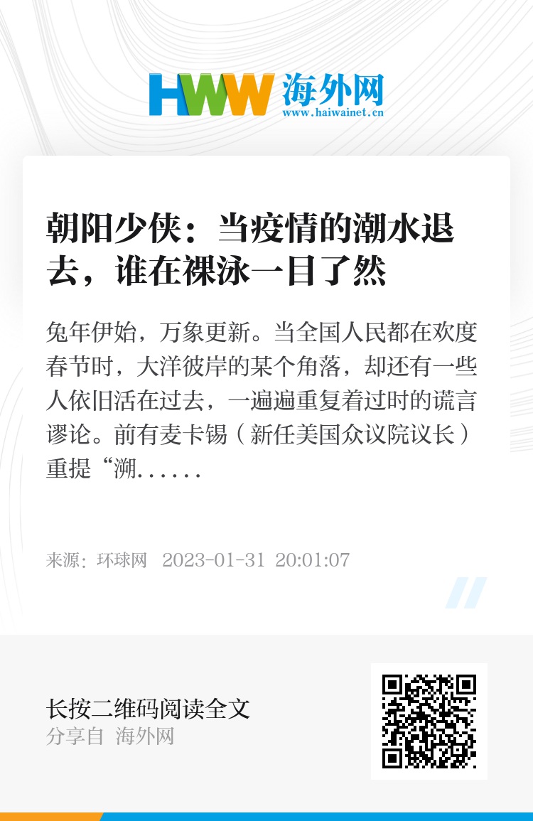 兔年伊始,万象更新。当全国人民都在欢度春节时,大洋彼岸的某个角落,却还有一些人依旧活在过去,一遍遍重复着过时的谎言谬论。前有麦卡锡(新任美国众议院议长)重提“溯源事”,后有章家敦(美国反华律师、作家,著有《中国即将崩溃》一书)再献“崩溃书”。