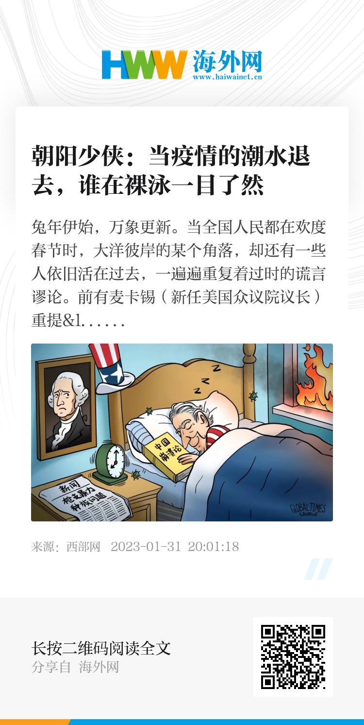 兔年伊始,万象更新。当全国人民都在欢度春节时,大洋彼岸的某个角落,却还有一些人依旧活在过去,一遍遍重复着过时的谎言谬论。前有麦卡锡(新任美国众议院议长)重提“溯源事”,后有章家敦(美国反华律师、作家,著有《中国即将崩溃》一书)再献“崩溃书”。
