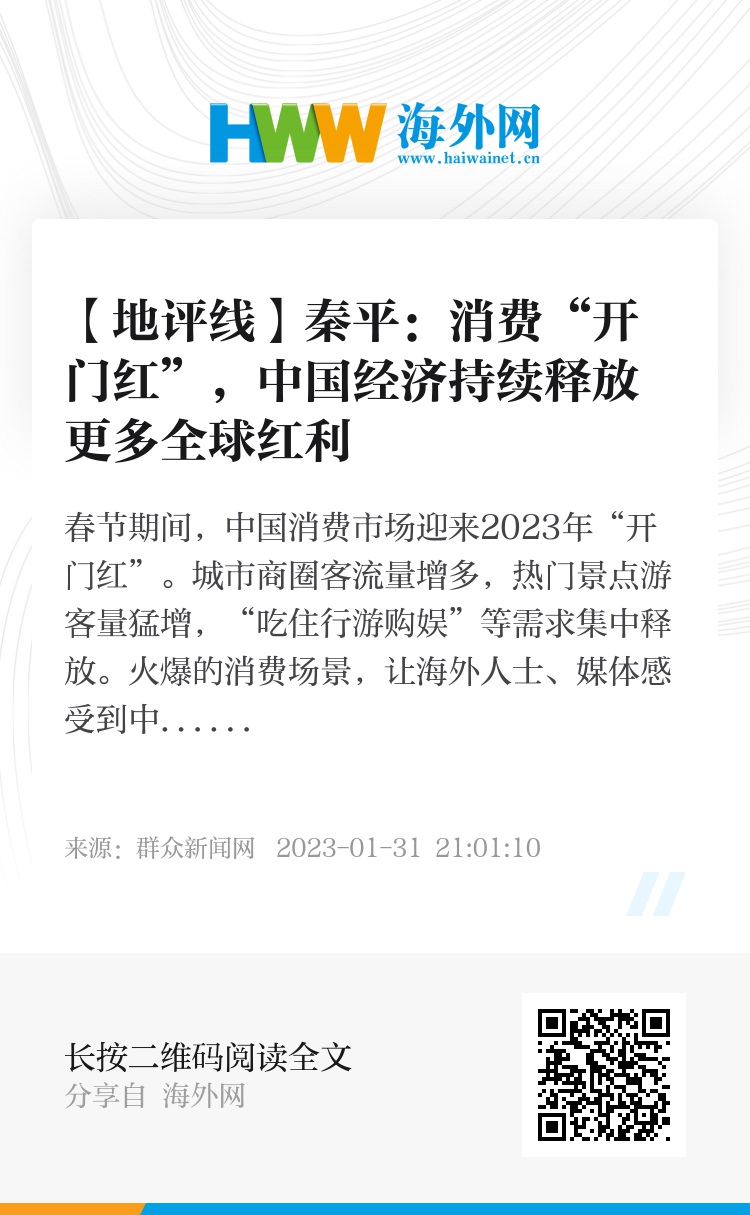 “不要人夸好颜色,只留清气满乾坤”。“洋年货”琳琅满目、餐饮生意红红火火……消费走热为全年发展开了好头、起了好步,也提振着全球对中国经济的信心。日前,一些外国投行纷纷上调中国2023年经济增长预期,荷兰国际集团和高盛就分别上调至5%和5.2%。可以肯定,随着需求逐步回升和政策效应叠加,中国经济社会活力将进一步释放,继续成为世界经济迈向复苏的“稳定器”和增长的“发动机”。