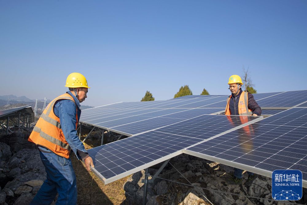 ↑1月30日,在贵州省黔西市一光伏电站项目施工现场,建设者在安装光伏组件。新华社发(史开心 摄)