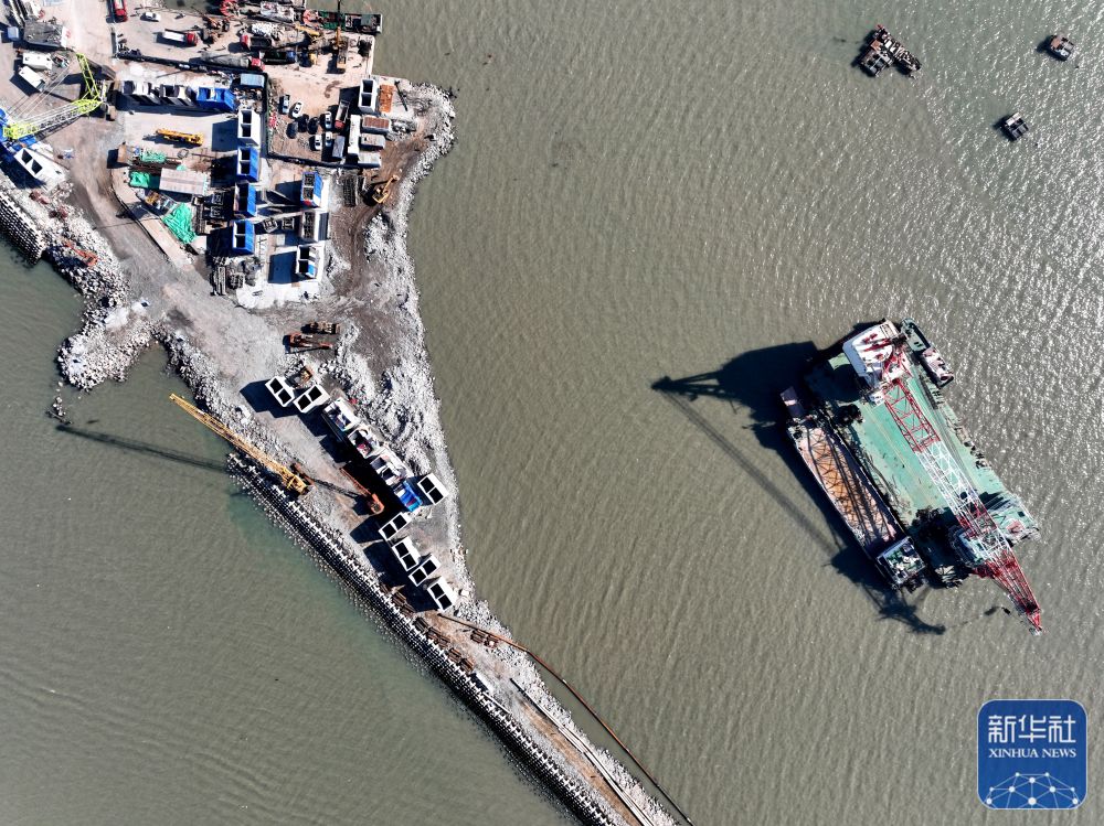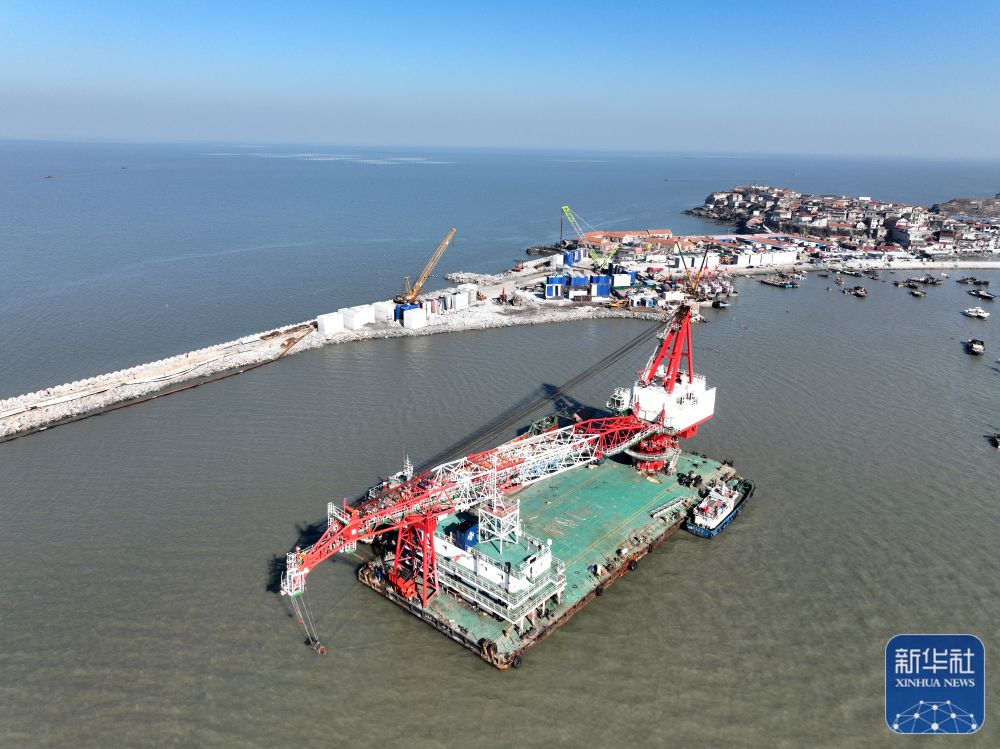 ↑1月29日,在江苏省连云港市连岛国家级中心渔港,大型浮吊在海上作业(无人机照片)。新华社发(王春摄)