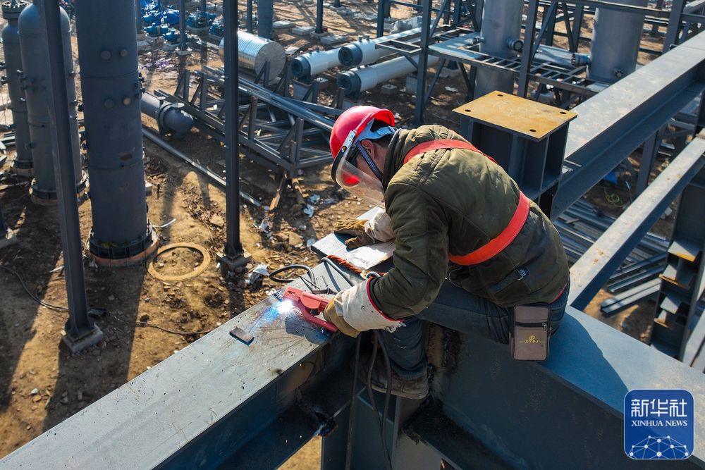 ↑1月30日,工人在湖北省孝感市云梦县盐化工循环利用产业园区进行电焊作业(无人机照片)。新华社发(胡学军摄)