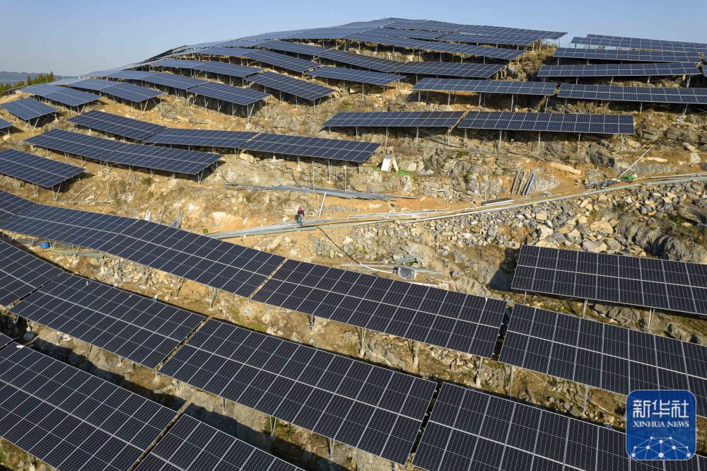 ↑1月30日,工人在贵州省黔西市一光伏电站项目施工现场忙碌(无人机照片)。新华社发(史开心 摄)