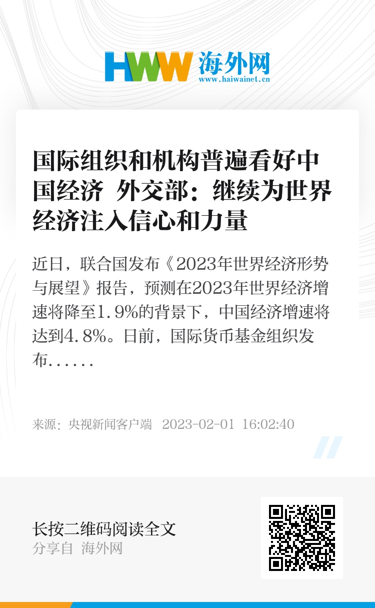 近日,联合国发布《2023年世界经济形势与展望》报告,预测在2023年世界经济增速将降至1.9%的背景下,中国经济增速将达到4.8%。日前,国际货币基金组织发布的《世界经济展望报告》也大幅上调今年中国经济增长预期至5.2%。中国外交部发言人毛宁在今天(1日)的例行记者会上表示,我注意到有关报告,也注意到近期,摩根士丹利、高盛、汇丰、摩根大通等多家国际投资机构纷纷上调2023年中国经济增速预测。