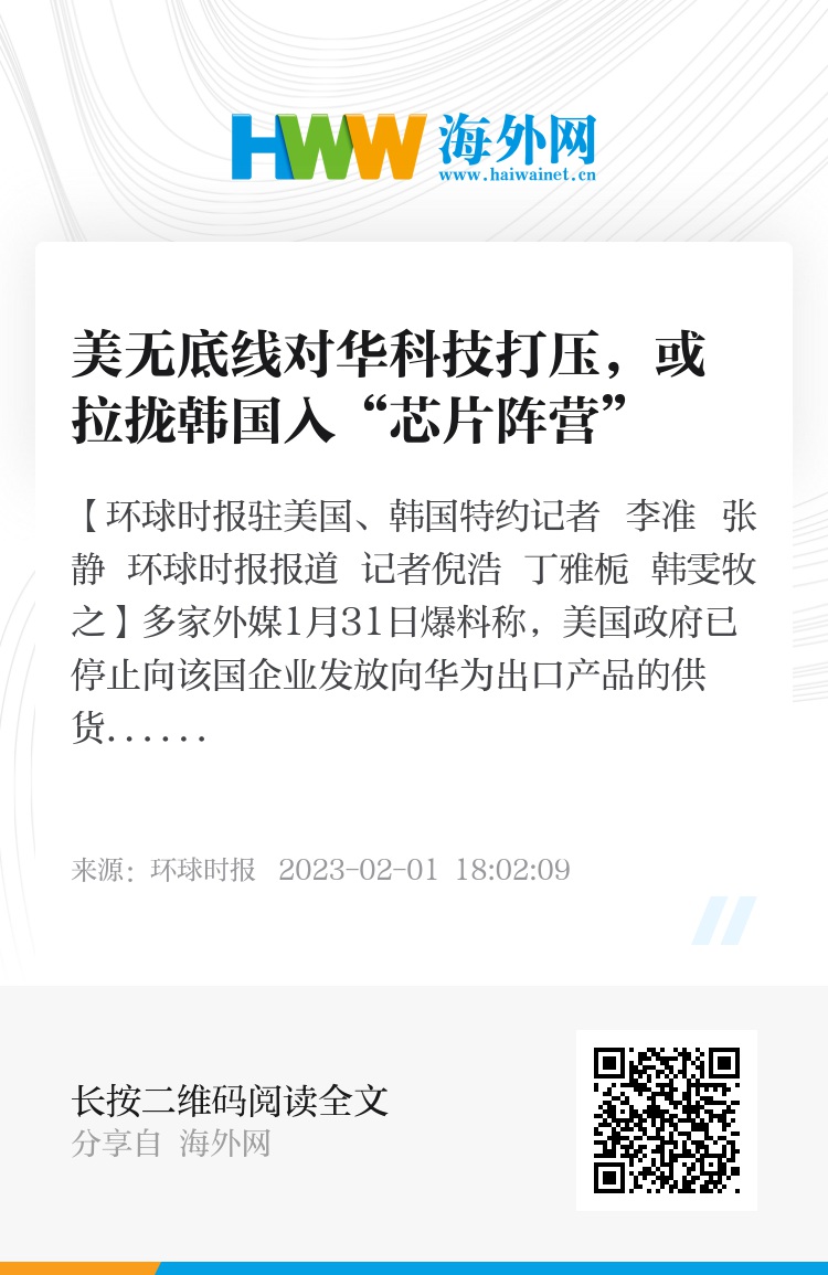 【环球时报驻美国、韩国特约记者 李准 张静 环球时报报道 记者倪浩 丁雅栀 韩雯牧之】多家外媒1月31日爆料称,美国政府已停止向该国企业发放向华为出口产品的供货许可证,正考虑切断美国供应商与中国华为公司之间的所有联系,禁止英特尔和高通等公司向华为提供任何产品。中国外交部发言人毛宁1月31日表示,中方坚决反对美方泛化国家安全概念、滥用国家力量,无底线、无理打压中国企业。外媒注意到,美国国务卿布林肯即将访华之际,美国对华动作不断,继拉拢荷兰和日本加入对中国芯片打压的阵营后,韩国国务总理韩德洙的最新表态也被媒体解读为,韩国似乎也有意加入美国主导的这一阵营。《日本时报》评论称,华盛顿一直在利用经济工具实现外交政策目标——向北京施压,为了在与中国的竞争中胜出,不惜扭曲自由贸易原则。中国学者警告称,虽然布林肯将访华,但如果美方不修正、不调整对华政策,中美关系改善恐怕难以取得真正的突破。