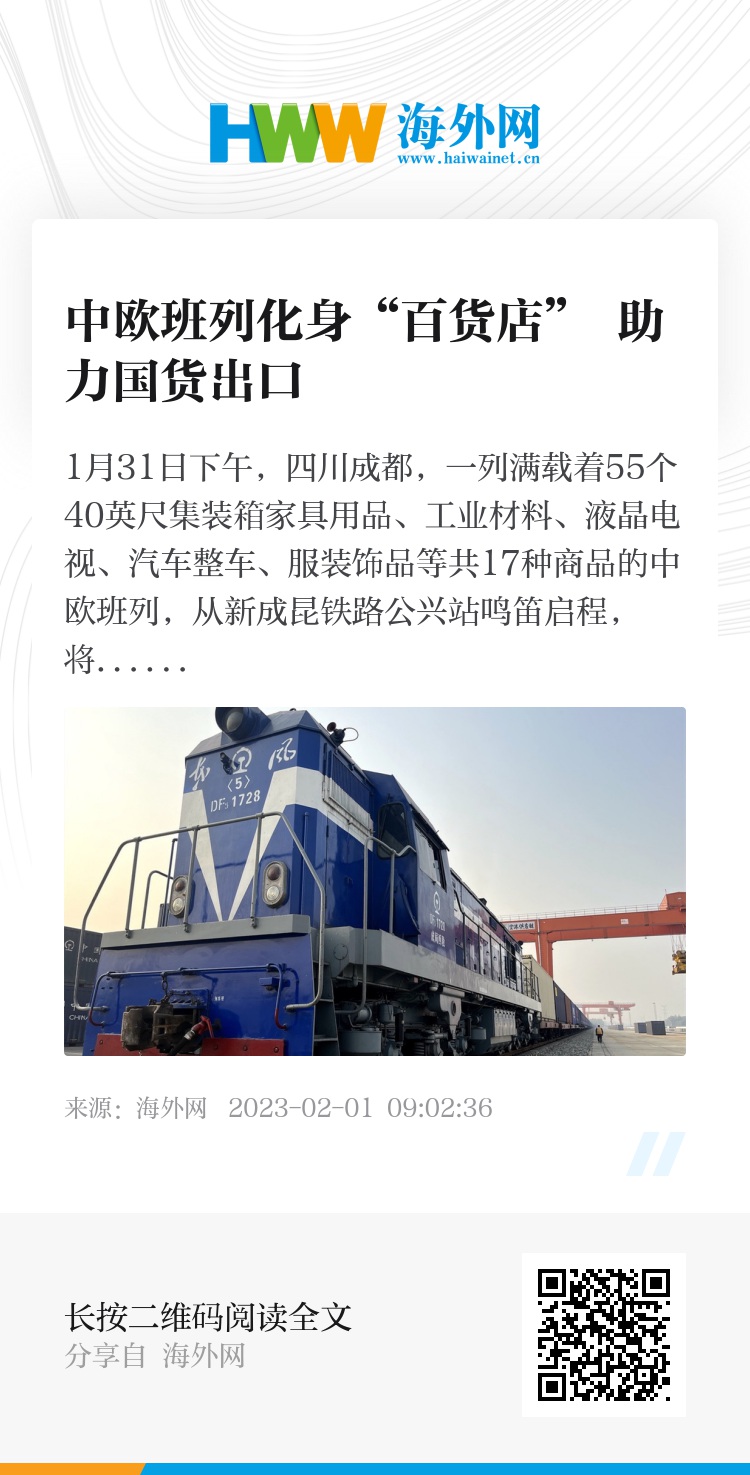 1月31日下午,四川成都,一列满载着55个40英尺集装箱家具用品、工业材料、液晶电视、汽车整车、服装饰品等共17种商品的中欧班列,从新成昆铁路公兴站鸣笛启程,将经新疆霍尔果斯口岸出境,发往俄罗斯谢里亚季诺,为海外消费者送去诚意满满的“中国货”。图片来源:IC photo
