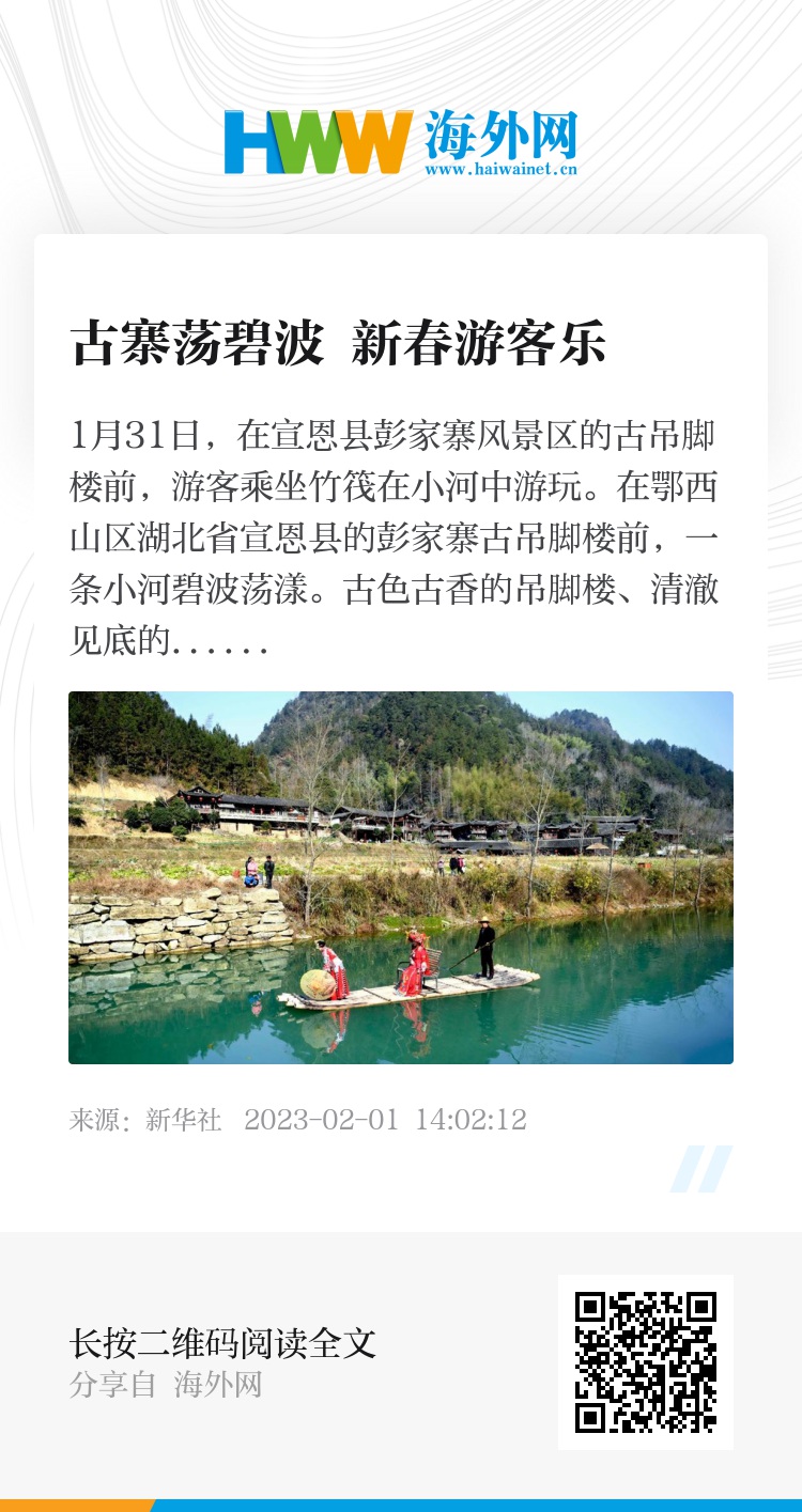 1月31日,在宣恩县彭家寨风景区的古吊脚楼前,游客乘坐竹筏在小河中游玩。在鄂西山区湖北省宣恩县的彭家寨古吊脚楼前,一条小河碧波荡漾。古色古香的吊脚楼、清澈见底的河水、晃晃悠悠的吊桥,构成一幅“小桥流水人家”的乡村画卷,吸引游客前往赏景游玩。新华社发(宋文摄)