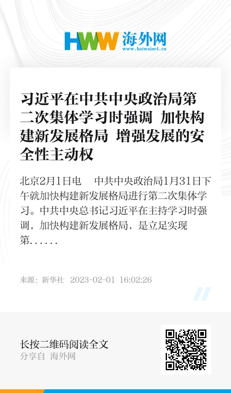 新华社北京2月1日电 中共中央政治局1月31日下午就加快构建新发展格局进行第二次集体学习。中共中央总书记习近平在主持学习时强调,加快构建新发展格局,是立足实现第二个百年奋斗目标、统筹发展和安全作出的战略决策,是把握未来发展主动权的战略部署。只有加快构建新发展格局,才能夯实我国经济发展的根基、增强发展的安全性稳定性,才能在各种可以预见和难以预见的狂风暴雨、惊涛骇浪中增强我国的生存力、竞争力、发展力、持续力,确保中华民族伟大复兴进程不被迟滞甚至中断,胜利实现全面建成社会主义现代化强国目标。
