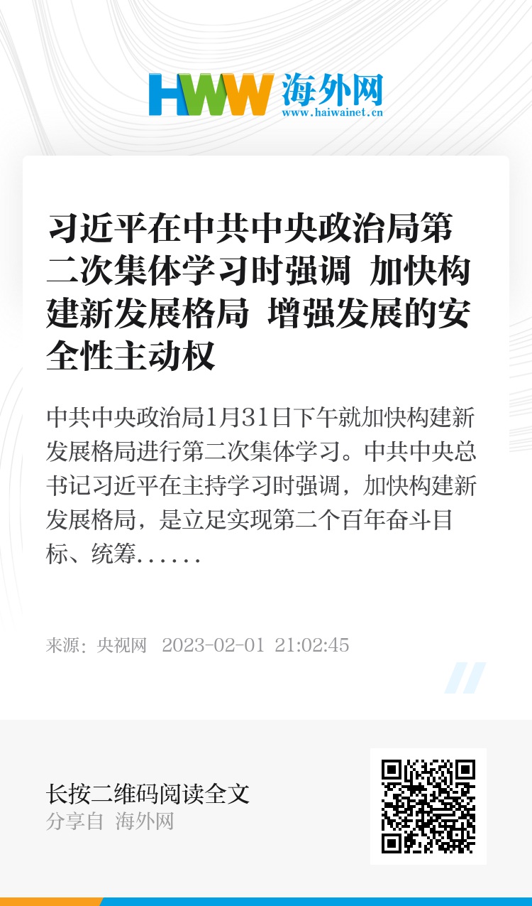 中共中央政治局1月31日下午就加快构建新发展格局进行第二次集体学习。中共中央总书记习近平在主持学习时强调,加快构建新发展格局,是立足实现第二个百年奋斗目标、统筹发展和安全作出的战略决策,是把握未来发展主动权的战略部署。只有加快构建新发展格局,才能夯实我国经济发展的根基、增强发展的安全性稳定性,才能在各种可以预见和难以预见的狂风暴雨、惊涛骇浪中增强我国的生存力、竞争力、发展力、持续力,确保中华民族伟大复兴进程不被迟滞甚至中断,胜利实现全面建成社会主义现代化强国目标。