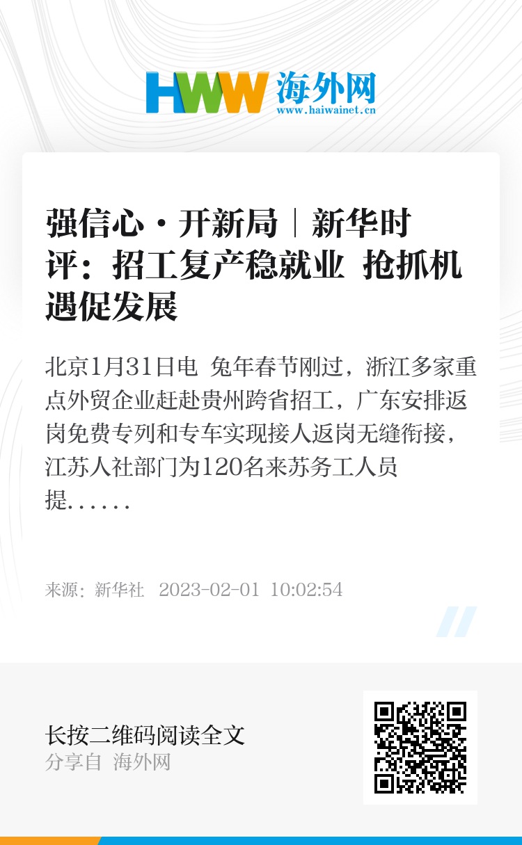 招工“先人一步”,抢抓“复工先机”,反映了各地全力拼经济的信心决心,也是众多企业订单增长、用工出现缺口的市场选择。兔年新春佳节,中国国内游出游超3亿人次,春节档电影票房突破67亿元,无论是旅游热还是消费潮,都体现出中国人民对美好生活的向往和对国家发展的信心,也给世界经济复苏带来满满的正能量。