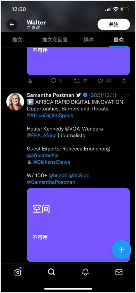 Africa Archives所谓的创始人Gido,在推特上有两个代表其身份的账号。其中一个账号,明确关注了两个非常有标志性的人物,一个是VOA非洲分部的负责人Kennedy Wandera,另一个是个加拿大投资商Samantha Postman。