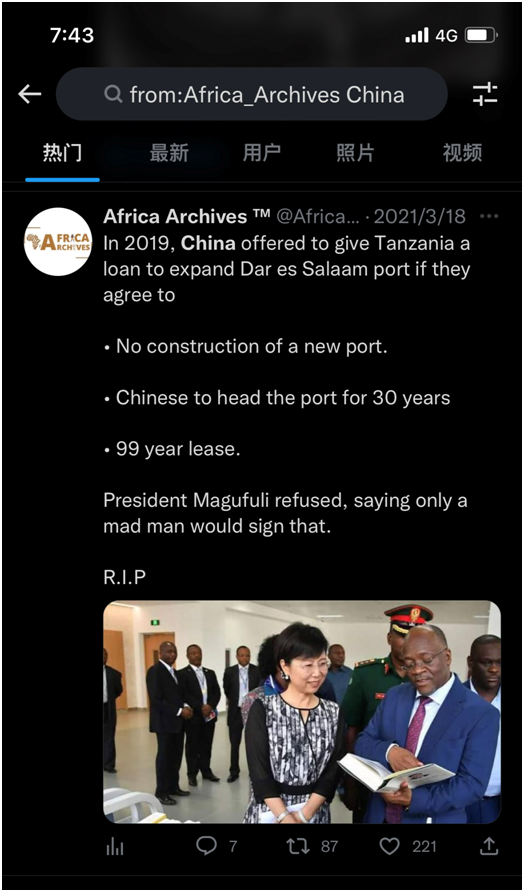 例如:在一条挑唆中国和坦桑尼亚关系的推文中,Africa Archives借着坦桑尼亚前总统马古富力逝世,宣称他2019年曾拒绝了中国的“无理要求”,称“疯子才会和中国签协议”。然而,配图却是中国援建坦桑尼亚达累萨拉姆大学图书馆的交接仪式上,王克大使和马古富力总统的亲切互动。