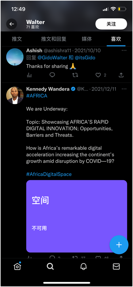 观察他们互动的痕迹,我们还发现,Gido与Kennedy以及Samantha的关系也很紧密。早在2011年12月11日,在VOA的主持下,一场名为“非洲迅速的数字创新:机遇、壁垒与挑战”的活动正在进行中。Kennedy发推做了预告,Samantha也在同一时间发推做了硬广,而活动提到人物中就有Africa Archives的管理者Gido。