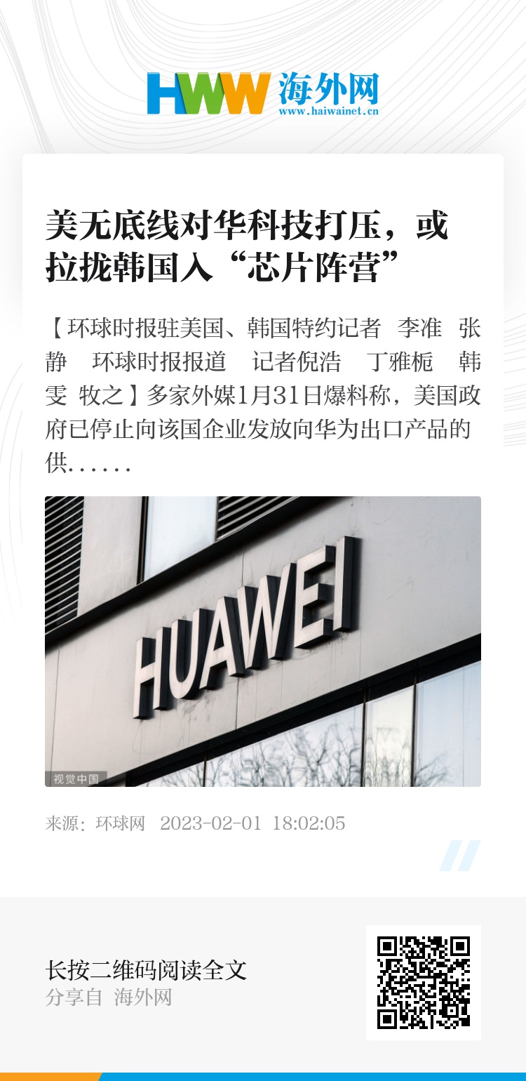 【环球时报驻美国、韩国特约记者 李准 张静 环球时报报道 记者倪浩 丁雅栀 韩雯 牧之】多家外媒1月31日爆料称,美国政府已停止向该国企业发放向华为出口产品的供货许可证,正考虑切断美国供应商与中国华为公司之间的所有联系,禁止英特尔和高通等公司向华为提供任何产品。中国外交部发言人毛宁1月31日表示,中方坚决反对美方泛化国家安全概念、滥用国家力量,无底线、无理打压中国企业。外媒注意到,美国国务卿布林肯即将访华之际,美国对华动作不断,继拉拢荷兰和日本加入对中国芯片打压的阵营后,韩国国务总理韩德洙的最新表态也被媒体解读为,韩国似乎也有意加入美国主导的这一阵营。《日本时报》评论称,华盛顿一直在利用经济工具实现外交政策目标——向北京施压,为了在与中国的竞争中胜出,不惜扭曲自由贸易原则。中国学者警告称,虽然布林肯将访华,但如果美方不修正、不调整对华政策,中美关系改善恐怕难以取得真正的突破。