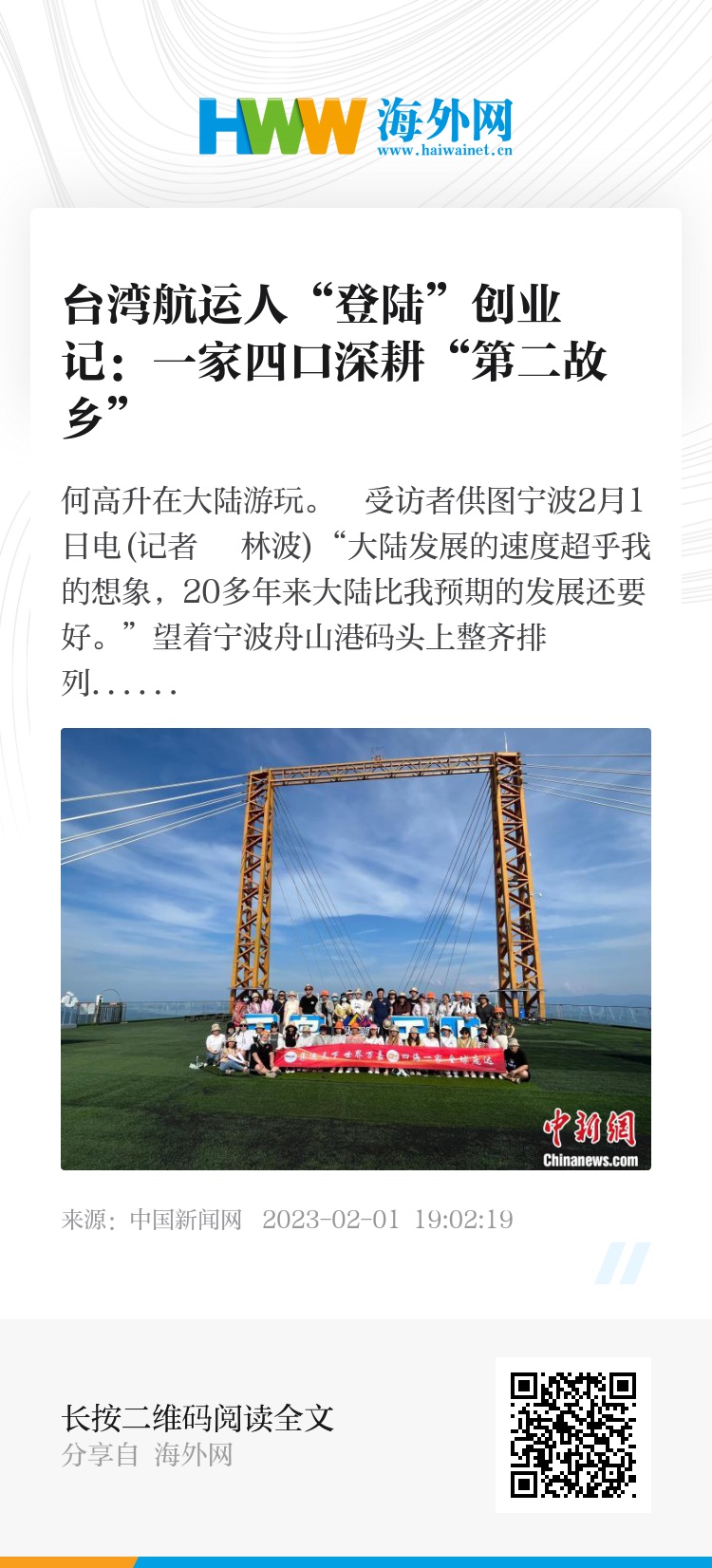 中新网宁波2月1日电(记者 林波)“大陆发展的速度超乎我的想象,20多年来大陆比我预期的发展还要好。”望着宁波舟山港码头上整齐排列的集装箱,台湾航运人何高升于近日接受采访时表示,自2002年来到大陆创业创新,他见证了大陆航运业的转型升级,也有幸与大陆发展同频共振,“一家四口在这里安居乐业,幸福感满满。”