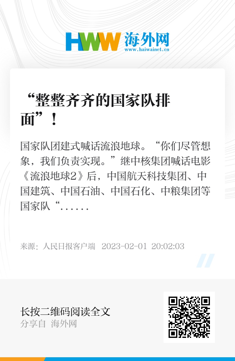 “你们尽管想象,我们负责实现。”继中核集团喊话电影《流浪地球2》后,中国航天科技集团、中国建筑、中国石油、中国石化、中粮集团等国家队“团建式”前来报到。网友:整整齐齐的国家队排面,这联动太硬核了!
